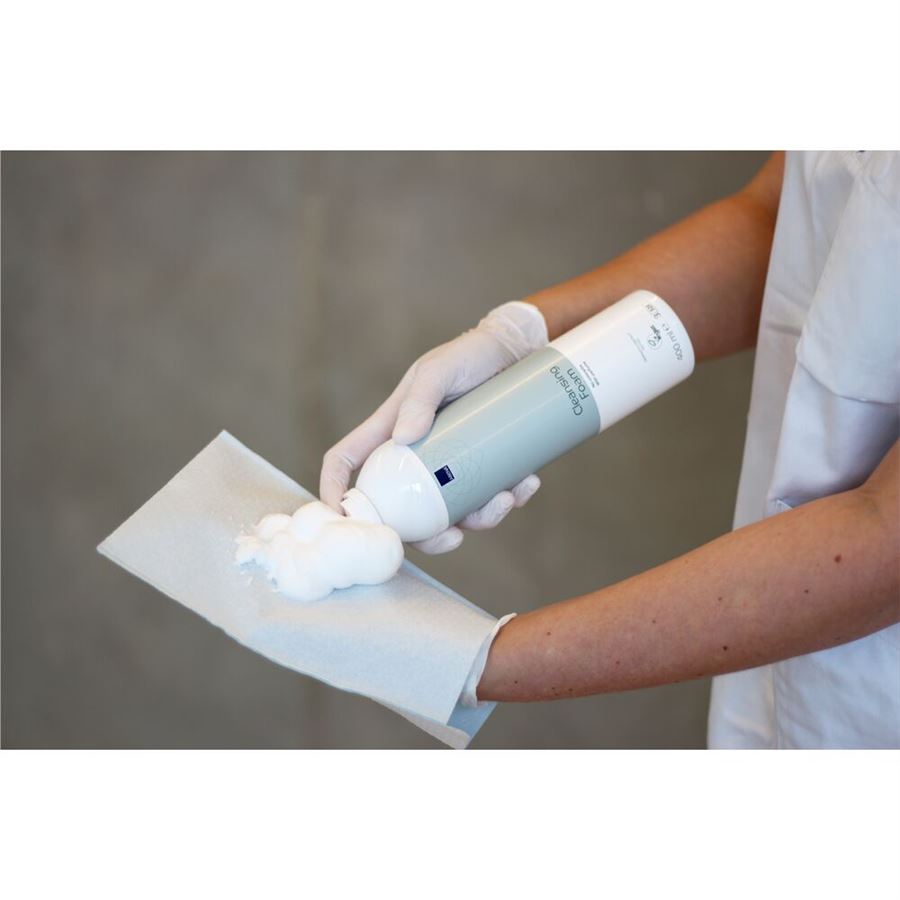 Způsob použití: Před použitím nádobku protřepejte. Naneste pěnu přímo na nečistoty nebo na mycí utěrku. Nechte krátce působit a poté jemně setřete. Pěna se neoplachuje vodou, což usnadňuje péči v domácím i nemocničním prostředí.