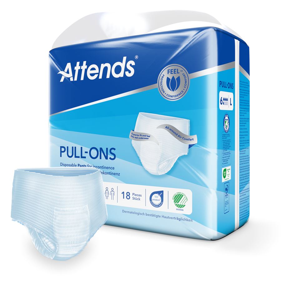 Představujeme navlékací kalhotky Attends Pull-Ons Unisex, které poskytují spolehlivou ochranu a maximální pohodlí pro muže i ženy. Tyto kalhotky jsou ideální volbou pro osoby s lehkou, střední i těžkou inkontinencí, které hledají diskrétní a efektivní řešení pro každodenní nošení. Skvělý tvar Attends Pull-Ons Attends zajišťuje perfektní pohodlí. Vysoce savé jádro chrání před únikem a zápachem, pro aktivní život s pocitem bezpečí.