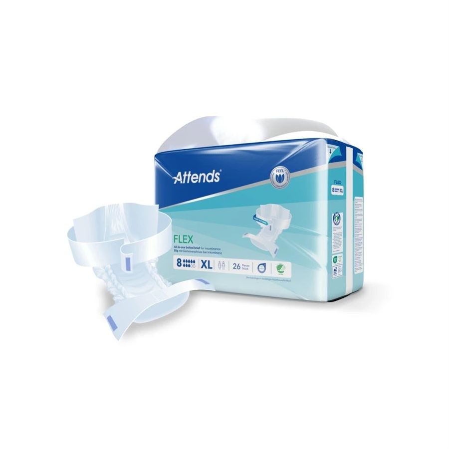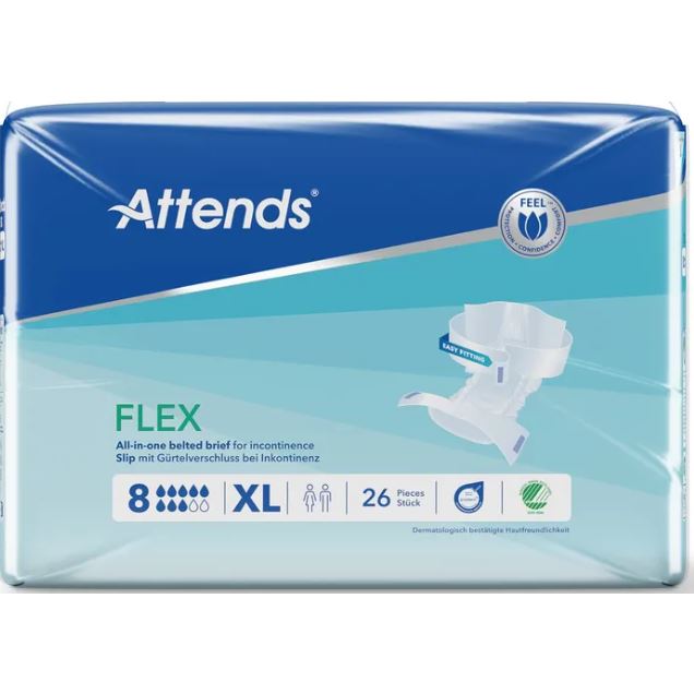 Attends Flex jsou absorpční kalhotky s fixačním pásem na suchý zip, navržené pro maximální pohodlí a ochranu při těžké inkontinenci. Tyto kalhotky jsou vhodné i pro osobys anatomickými odlišnostmi nebo specifickými zdravotními potřebami, protože umožňují snadné přizpůsobení a zajišťují tak maximální komfort a diskrétnost.