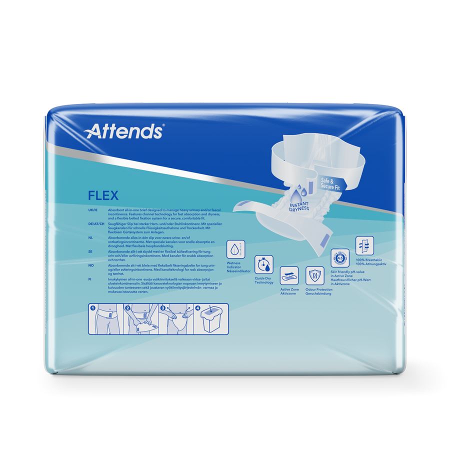 Attends Flex jsou absorpční kalhotky s fixačním pásem na suchý zip, navržené pro maximální pohodlí a ochranu při těžké inkontinenci.