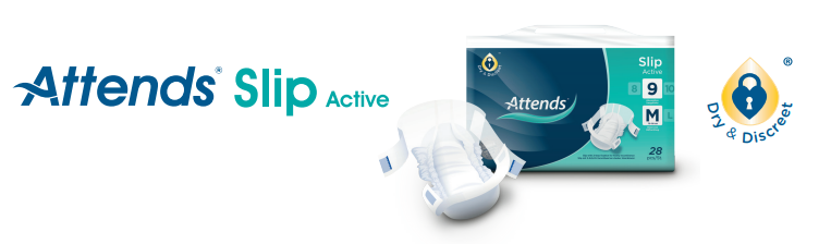 Attends Slip Active jsou navrženy s důrazem na pohodlí, ochranu a diskrétnost, pro zvládnutí těžké inkontinence moči nebo stolice. Fixační systém ve dvou krocích umožňuje opakovanou fixaci pomůcky na správném místě a poskytuje tak spolehlivé řešení inkontinence.