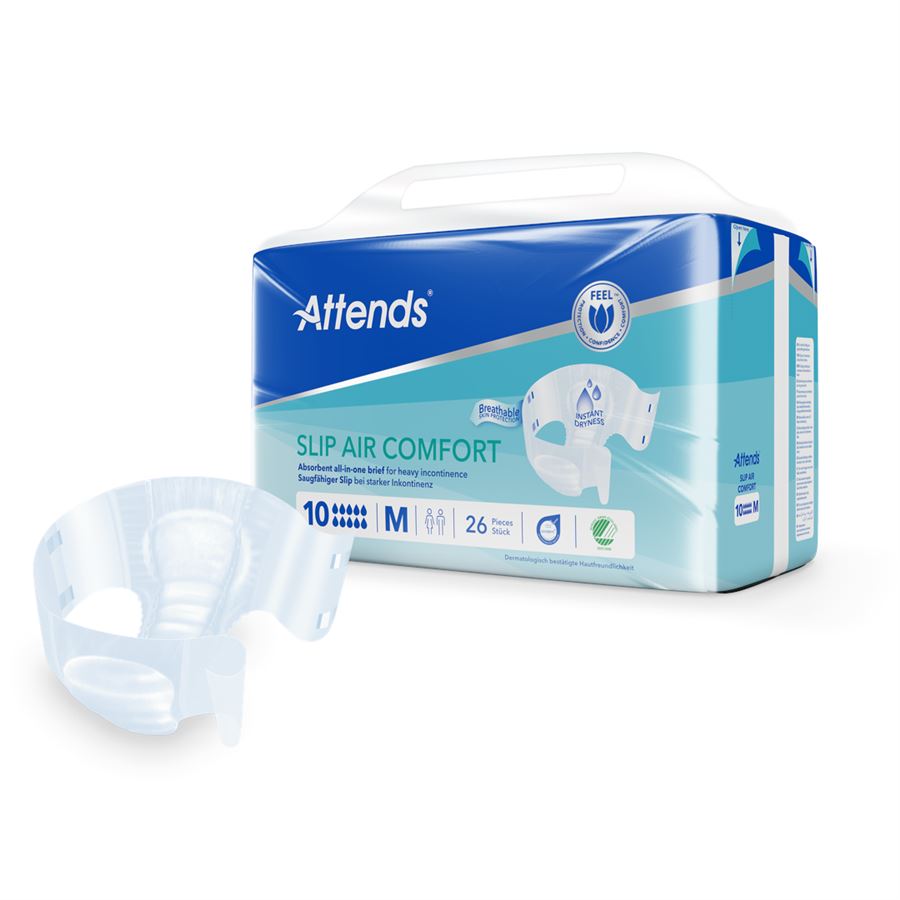 Attends Slip Air Comfort jsou absorpční kalhotky typu „all‑in‑one“ s technologií kanálků pro rychlou absorpci a suchost. Jsou určeny ke zvládání těžké inkontinence moči a/anebo stolice.