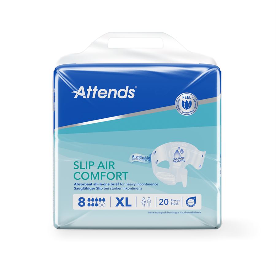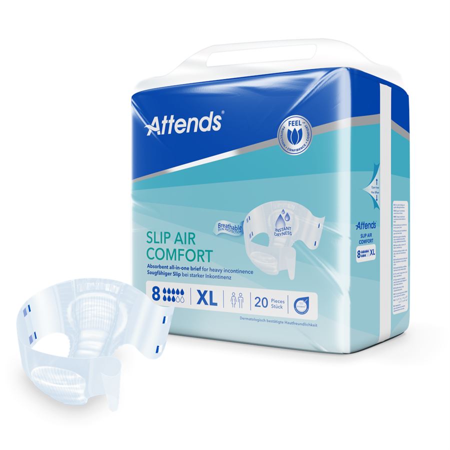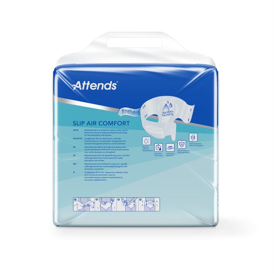 Attends Slip Air Comfort jsou absorpční kalhotky typu „all‑in‑one“ s technologií kanálků pro rychlou absorpci a suchost. Jsou určeny ke zvládání těžké inkontinence moči a/anebo stolice.