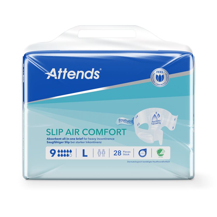 Attends Slip Air Comfort 9 jsou zalepovací absorpční kalhotky využívající technologii vnitřních kanálků pro rychlu absorpci a zajištění sucha. Jsou určeny pro řešení těžké inkontinence moči nebo stolice. Opakovaně uzavíratelné fixační pásky bezpečně udržují pomůcku na místě a minimalizují tak riziko protečení. Prodyšný materiál má schopnost propouštět vzduch. Použití tohoto materiálu pomáhá, aby byla pokožka vystavena vzduchu, který může stimulovat zdraví pokožky, aniž by docházelo k protečení.