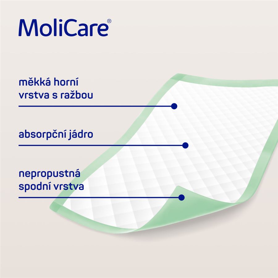 Podložka MoliCare Bed Mat je určena pro osoby s těžkou inkontinencí. V kombinaci s jinými inkontinenčními pomůckami navyšuje ochranu lůžka před poskvrněním. Absorpční jádro z celulózy zajišťuje vysokou savost. Celý povrch je potažený netkanou textilií. Spodní strana je potažena neklouzavou a nepropustnou fólií, která drží ložní prádlo v suchu. Neklouzavá spodní strana drží podložku na jednom místě a zabraňuje jejímu pohybu po lůžku.