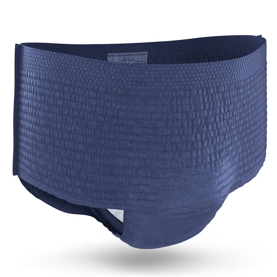 Tmavě modré inkontinenční spodní prádlo TENA Men Pants pro muže se středním až těžkým únikem moči. Vypadá jako spodní prádlo, chrání jako TENA.