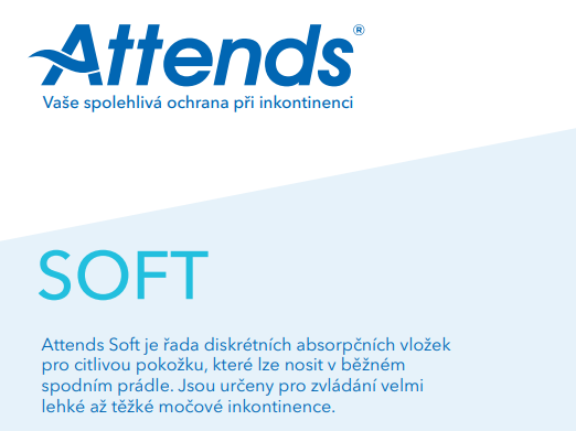 Attends Soft 3 jsou malé anatomicky tvarované vložky určené pro lehkou inkontinenci moči. Tato vložka má hedvábně měkkou vrchní vrstvu s texturou pro větší pohodlí a má lepicí proužek pro bezpečné uchycení podložky ve spodním prádle. Můžete tak mít jistotu, že zůstanete v suchu. Aktivní zóna je název pro střední část pomůcky (také označovanou jako Mid-50), která obsahuje relativně vysoké procento absorpčního materiálu (buničiny a SAP) ve srovnání s okraji (přední a zadní část) pomůcky. Obecně se uznává, že „bod močení“ se nachází ve středu pomůcky, a proto je v této části potřeba vysoké absorpce. Quick-Dry je sací vrstva umístěná přímo pod horní vrstvou, kudy se moč dostává do pomůcky. Rychle odvádí moč pryč od pokožky do savého jádra a zabraňuje návratu moči na povrch. Zvládne několik úniků moče, aniž by to ovlivnilo fungování pomůcky. Tímto zajišťuje uživateli ochranu před zpětným prosakováním a zároveň suchou pokožku.