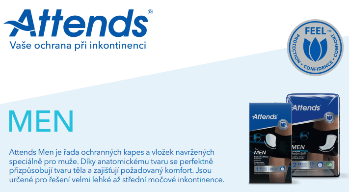 Attends MEN 2 jsou vložky speciálně navrženy pro muže s lehkým až středním únikem moči. Tyto vložky poskytují spolehlivou ochranu, pohodlí a diskrétnost, které muži potřebují v každodenním životě. Je vybavena superabsorpčním jádrem, které vám pomůže zůstat v suchu po celý den. Attends Men 3 jsou určeny pro muže, kteří vyžadují celodenní ochranu a u kterých občas dochází k úniku drobných kapek, například po použití toalety. Prodyšný materiál má schopnost propouštět vzduch. Použití tohoto materiálu pomáhá, aby byla pokožka vystavena vzduchu, který může stimulovat zdraví pokožky, aniž by docházelo k úniku moči. Ochrana proti zápachu SAP obsažený v savém jádru pomůcky pohlcuje moč a znemožňuje její návrat na povrch pomůcky, čímž snižuje riziko jejího úniku. Čím účinněji je moč uzamčena uvnitř jádra, tím menší je riziko tvorby amoniaku. Amoniak vzniká při kontaktu moči s kyslíkem a způsobuje nepříjemný zápach.