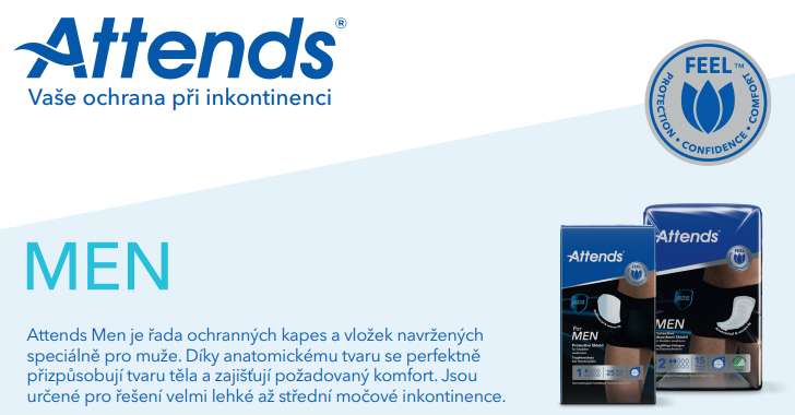 Attends For Men jsou vložky ve tvaru kapsy určené pro muže s lehkým únikem moči. Tato vložka, navržená pro mužskou anatomii, je tenká a diskrétní. Je vybavena superabsorpčním jádrem, které vám pomůže zůstat v suchu po celý den. Attends for Men jsou určeny pro muže, kteří vyžadují celodenní ochranu a u kterých občas dochází k úniku drobných kapek, například po použití toalety. Prodyšný materiál má schopnost propouštět vzduch. Použití tohoto materiálu pomáhá, aby byla pokožka vystavena vzduchu, který může stimulovat zdraví pokožky, aniž by docházelo k úniku moči. Ochrana proti zápachu SAP obsažený v savém jádru pomůcky pohlcuje moč a znemožňuje její návrat na povrch pomůcky, čímž snižuje riziko jejího úniku. Čím účinněji je moč uzamčena uvnitř jádra, tím menší je riziko tvorby amoniaku. Amoniak vzniká při kontaktu moči s kyslíkem a způsobuje nepříjemný zápach.