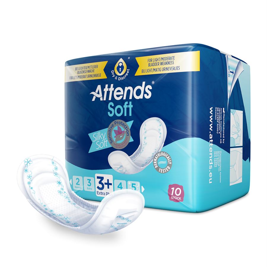 Attends Soft 3 Extra + jsou anatomicky tvarované vložky určené k lehké až střední inkontinenci moče. Tato vložka má hedvábně měkkou vrchní vrstvu s texturou pro větší pohodlí a lepící proužek pro bezpečné uchycení podložky ve spodním prádle. Můžete tak mít jistotu, že zůstanete v suchu. Díky širší zadní části poskytuje ještě větší ochranu. Aktivní zóna je název pro střední část pomůcky (také označovanou jako Mid-50), která obsahuje relativně vysoké procento absorpčního materiálu (buničiny a SAP) ve srovnání s okraji (přední a zadní část) pomůcky. Obecně se uznává, že „bod močení“ se nachází ve středu pomůcky, a proto je v této části potřeba vysoké absorpce. Quick-Dry je sací vrstva umístěná přímo pod horní vrstvou, kudy se moč dostává do pomůcky. Rychle odvádí moč pryč od pokožky do savého jádra a zabraňuje návratu moči na povrch. Zvládne několik úniků moče, aniž by to ovlivnilo fungování pomůcky. Tímto zajišťuje uživateli ochranu před zpětným prosakováním a zároveň suchou pokožku.